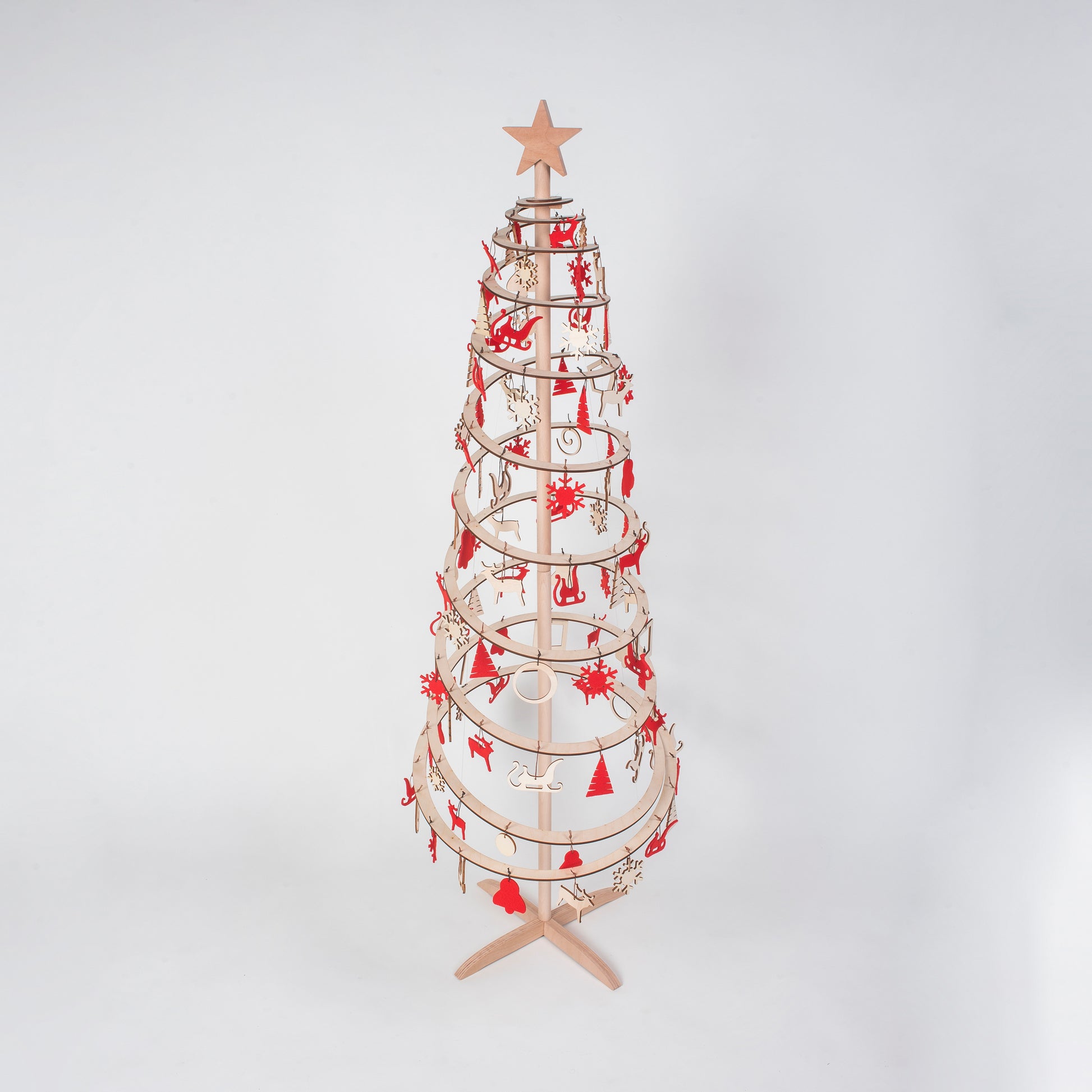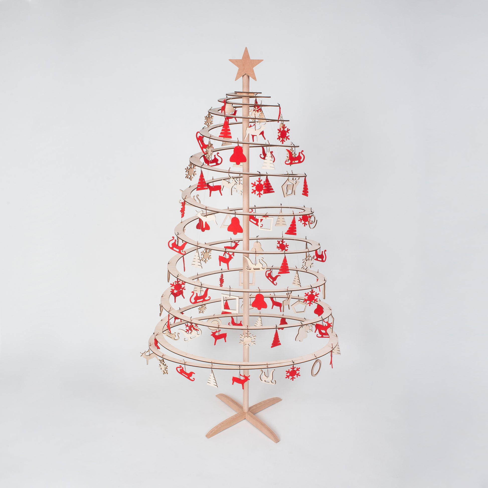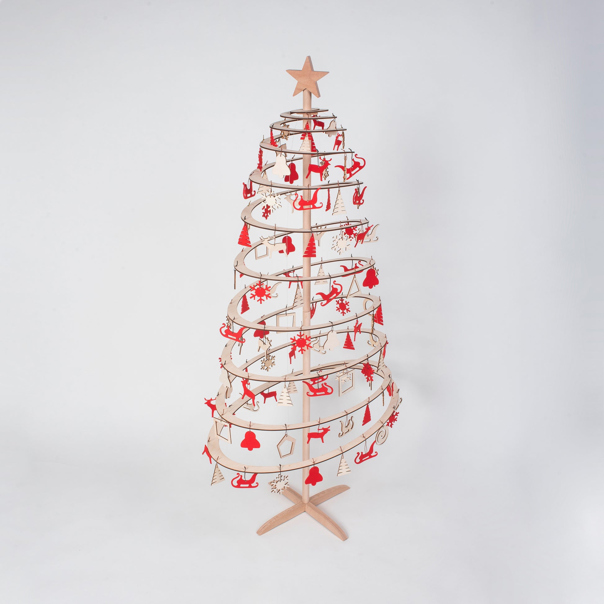 L'ensemble contient 111 décorations en feutre et en bois, ainsi qu'une étoile en bois pour la cime du sapin. Les matériaux naturels aux formes dynamiques apporteront chaleur et gaieté à votre intérieur, tandis que la couleur rouge créera une ambiance festive et animée.