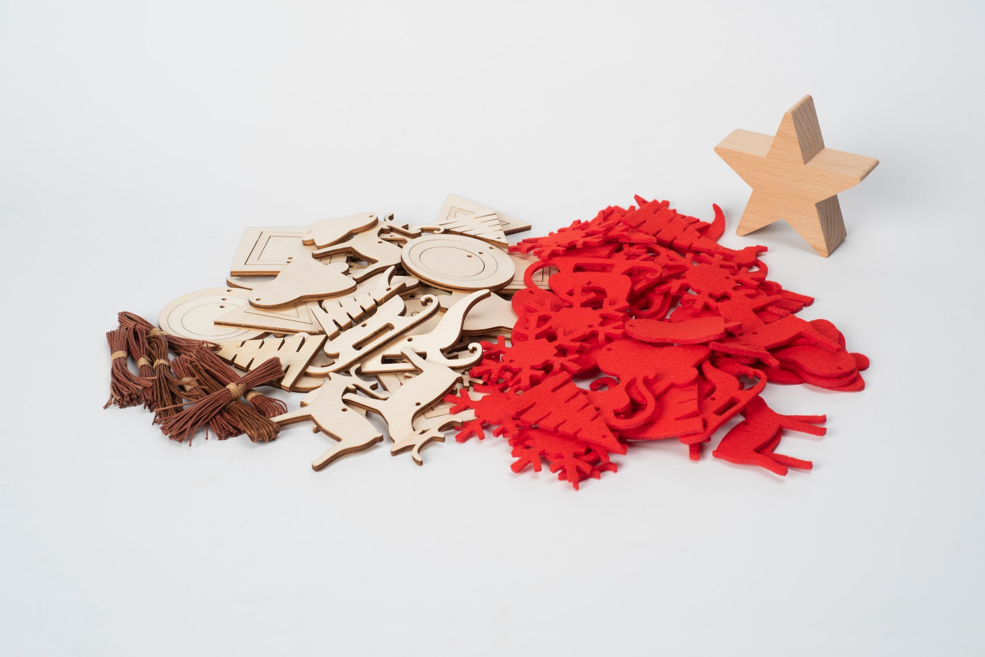 L'ensemble comprend une cime d'arbre en forme d'étoile en bois et un nombre approprié d'ornements en feutre rouge et en bois. Les cordons de suspension sont inclus.