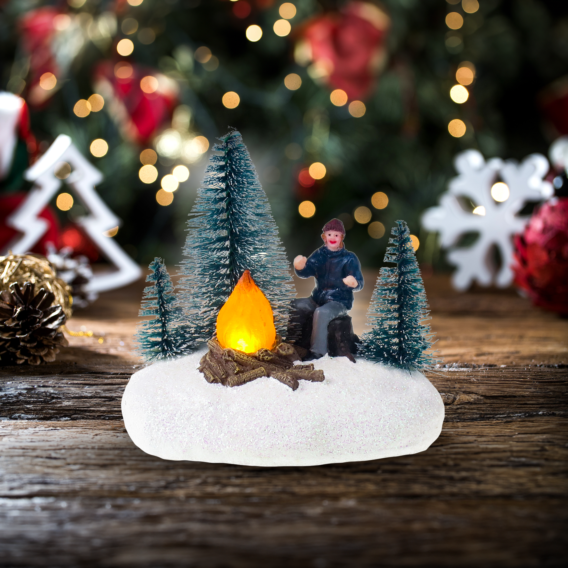 Cet objet donne vie à votre Village de Noël. Un feu de joie illumine l'obscurité du soir et l'homme à côté peut profiter de quelques instants de repos et de chaleur.