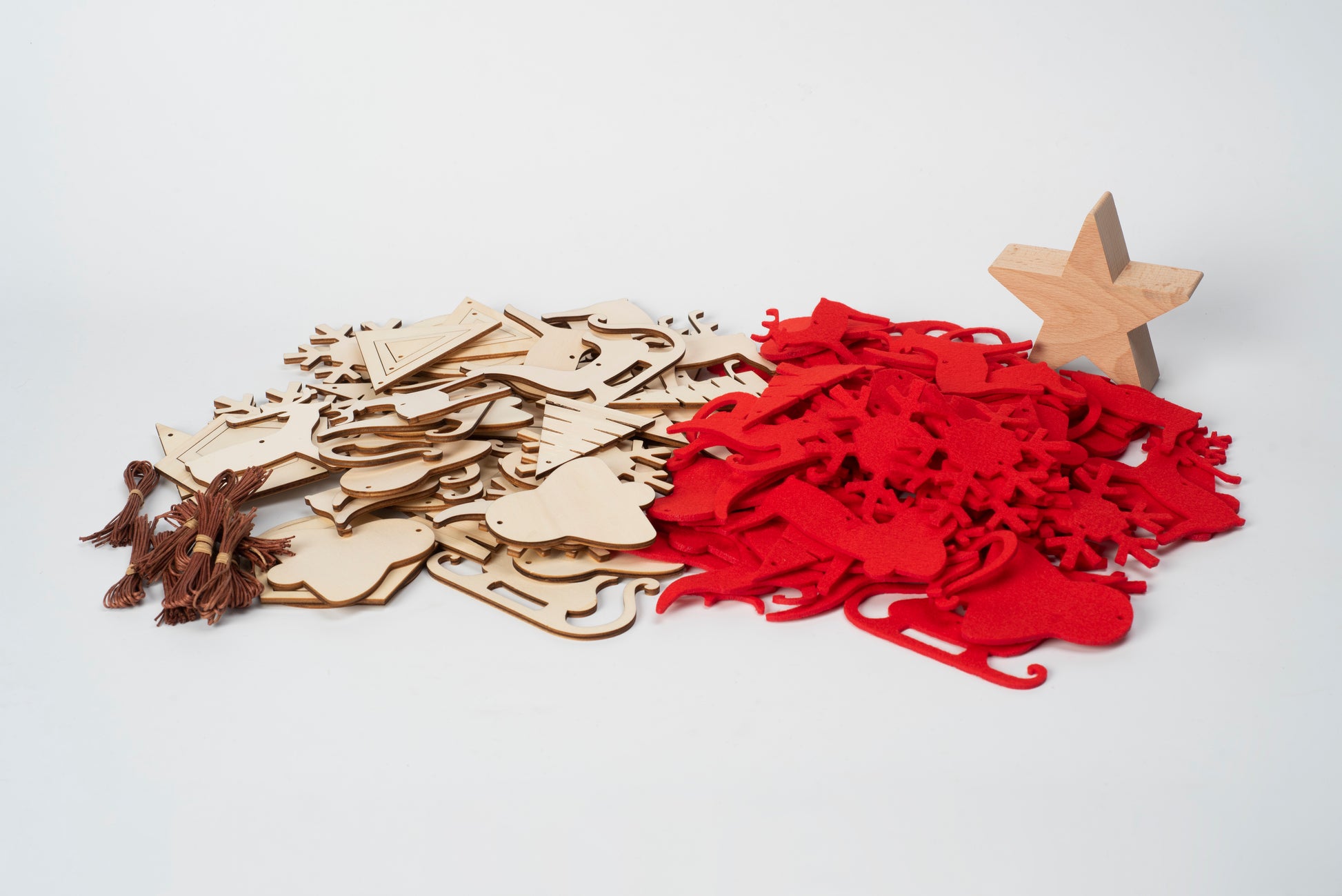 L'ensemble comprend une cime d'arbre en forme d'étoile en bois et un nombre approprié d'ornements en feutre rouge et en bois. Les cordons de suspension sont inclus.